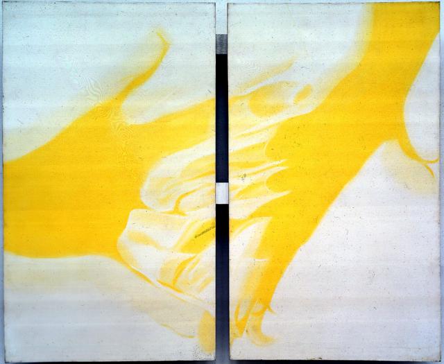 1966 Begins a series of walk-through, ceiling-suspended paintings on clear polyester film (Mylar).